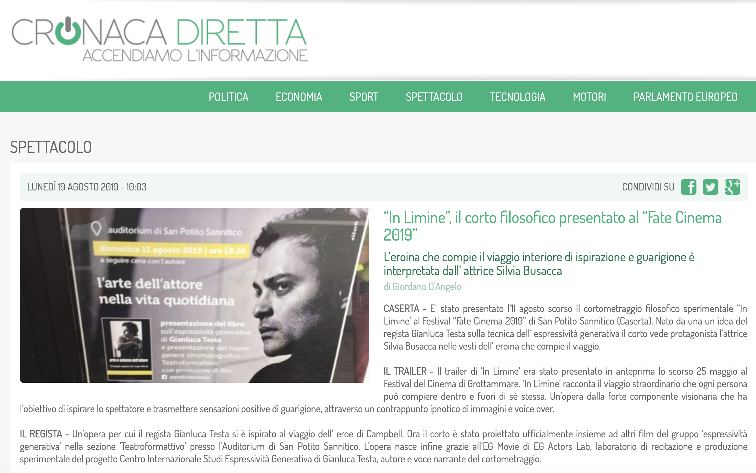 Gianluca Testa premiato come MIGLIOR REGISTA al GROTTAMMARE FAMILY FILM & WEB SERIES FESTIVAL 2019